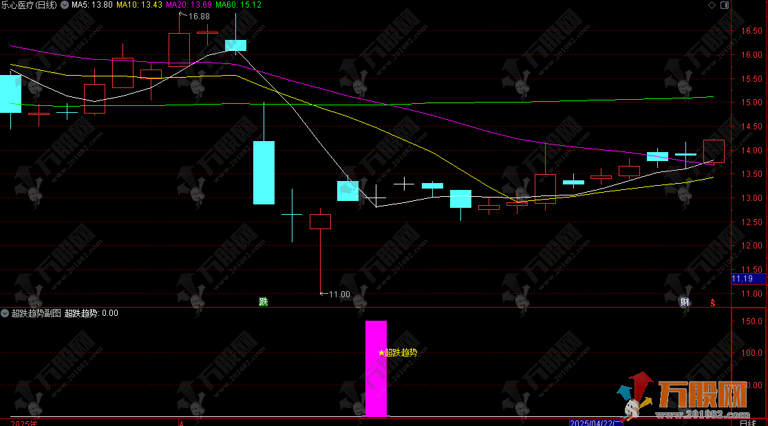 2、超跌线上穿其6日均线形成金叉,当三个条件同时满足时触发紫色柱状信号,标注超跌趋势。
