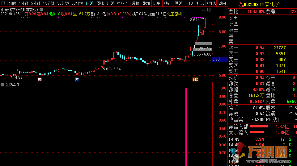 【金钻牵牛】是一款极具实战操作价值的超短线实战指标。指标全套包含副图、选股。下面信号例子: