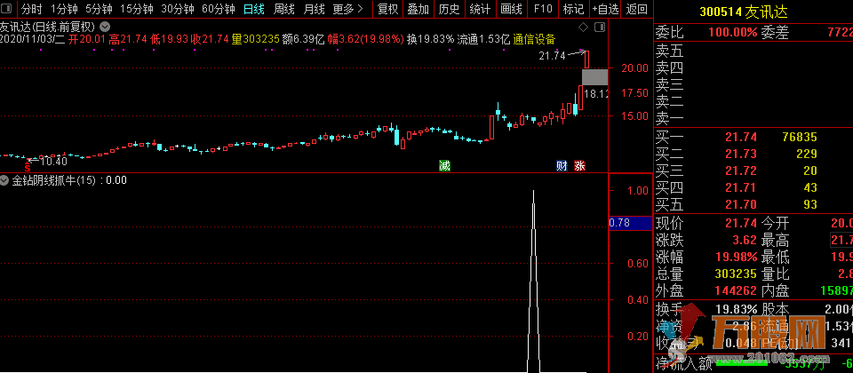 3、金钻趋势加速指标,为突破强势平台的信号,出信号当天可逢低关注,短线隔天获利即出;