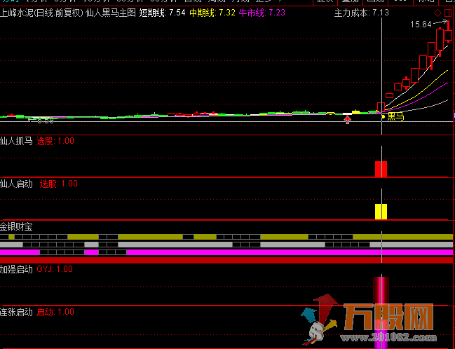 主力确立上升趋势后,在一个合适的时机必然猛烈拉抬股价。 “仙人抓马”信号就是主力猛烈拉抬股价开始的标志,操作重点:“主图黑马 仙人抓马 仙人启动”三个信号同日出现缺一不可。一种情况出信号位置是底部放量大阳线;第二种情况是突破平台或箱体的放量大阳线;选出三信号共振个股再看附图金银财宝指标四个级别趋势都走好的优先操作,在高位出信号的个股涨幅空间有限不追涨(如下图)。筛选后的个股基本所剩无几了 再从这里面选取一两只是目前热点的 或有概念的个股操作 。主图中的白色K线 红色箭头为二次启动信号,有些个股信号共振后继续洗盘,主图发出白色K线或红色箭头信号意味着洗盘结束即将二次启动的信号,白色K线 红色箭头共振的个股重点关注。
