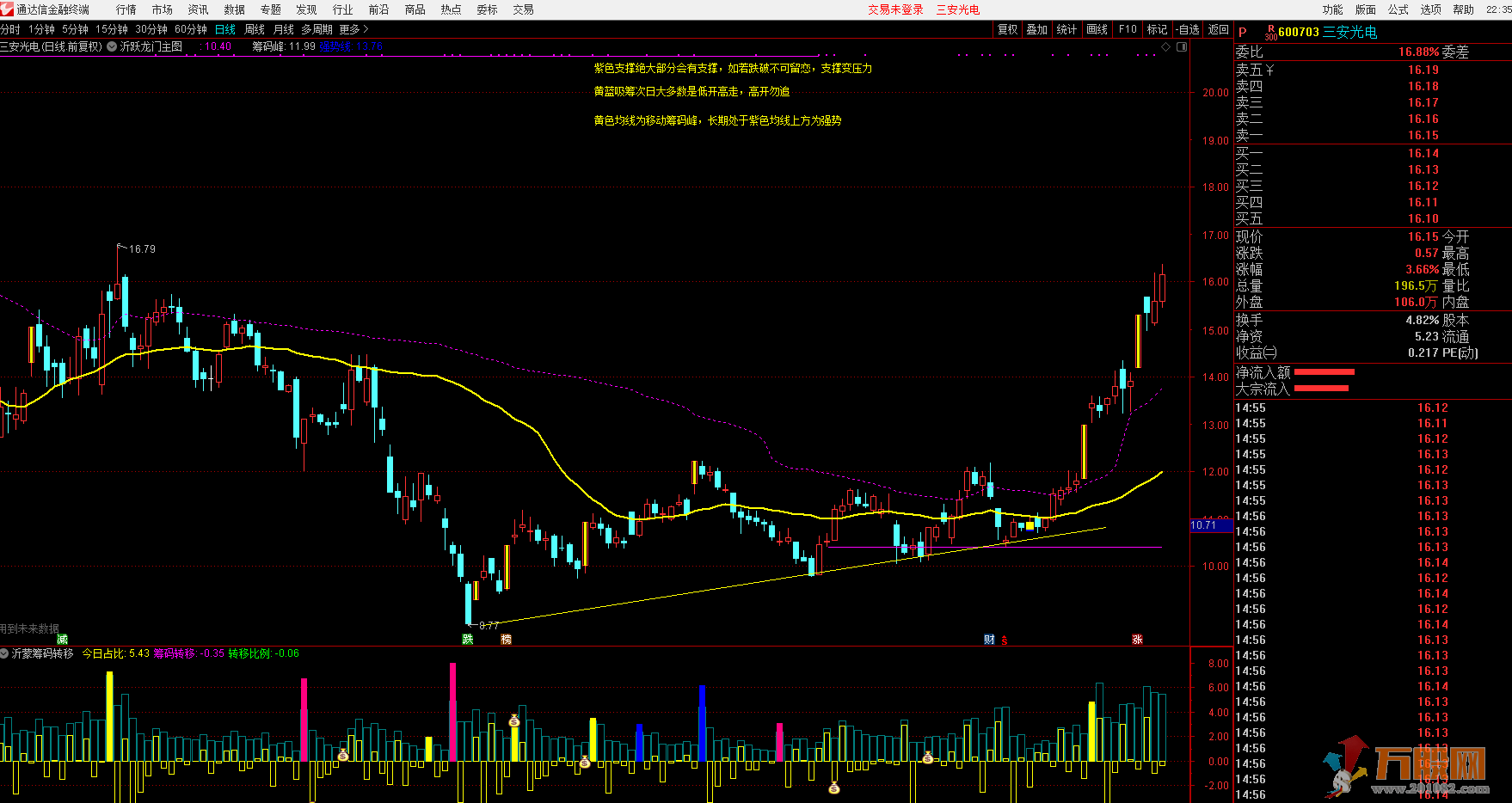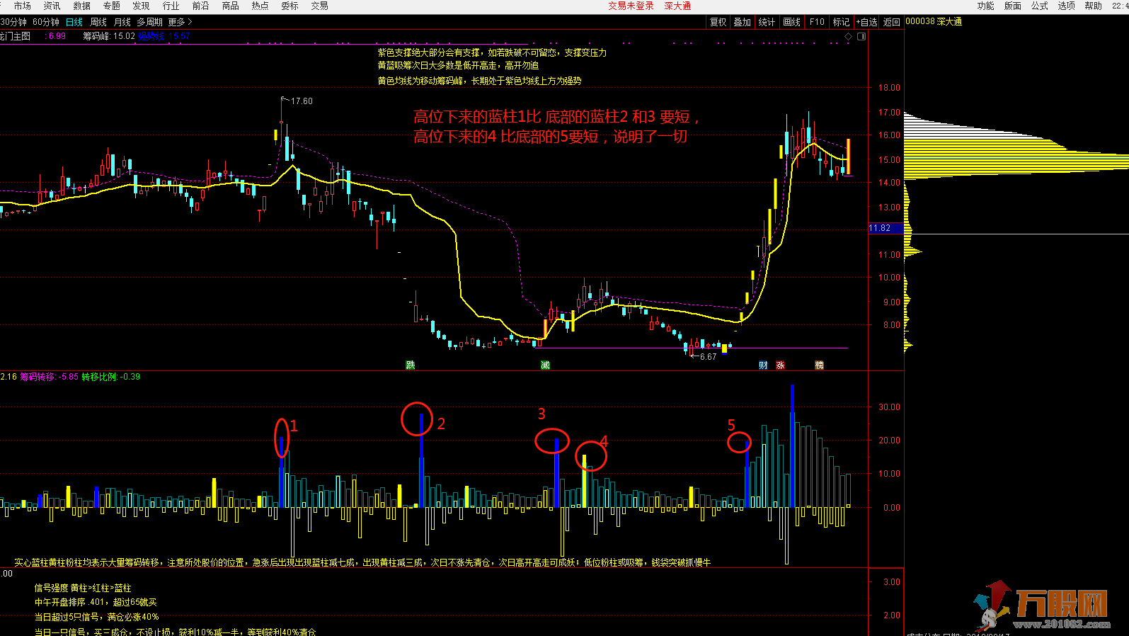 我这个筹码转移主要是针对两天出现大量筹码转移,达到一定标准出现蓝柱子。筹码转移用在区间震荡见顶是准确率极高,但是用在主升浪见顶不是特别准。筹码转移副图上面的蓝色柱子和黄色柱子, 表示在当天有大量筹码转移,如果处于高位就要小心了,可能被套。红色柱子表示下跌过程中出现大量筹码转移,这个位置可能会止跌, 这时候就要注意该票可能会企稳。黄蓝吸筹, 表示这个K线有吸筹,主力没有出货而已,这个位置不一定大涨,但是有止跌功效。