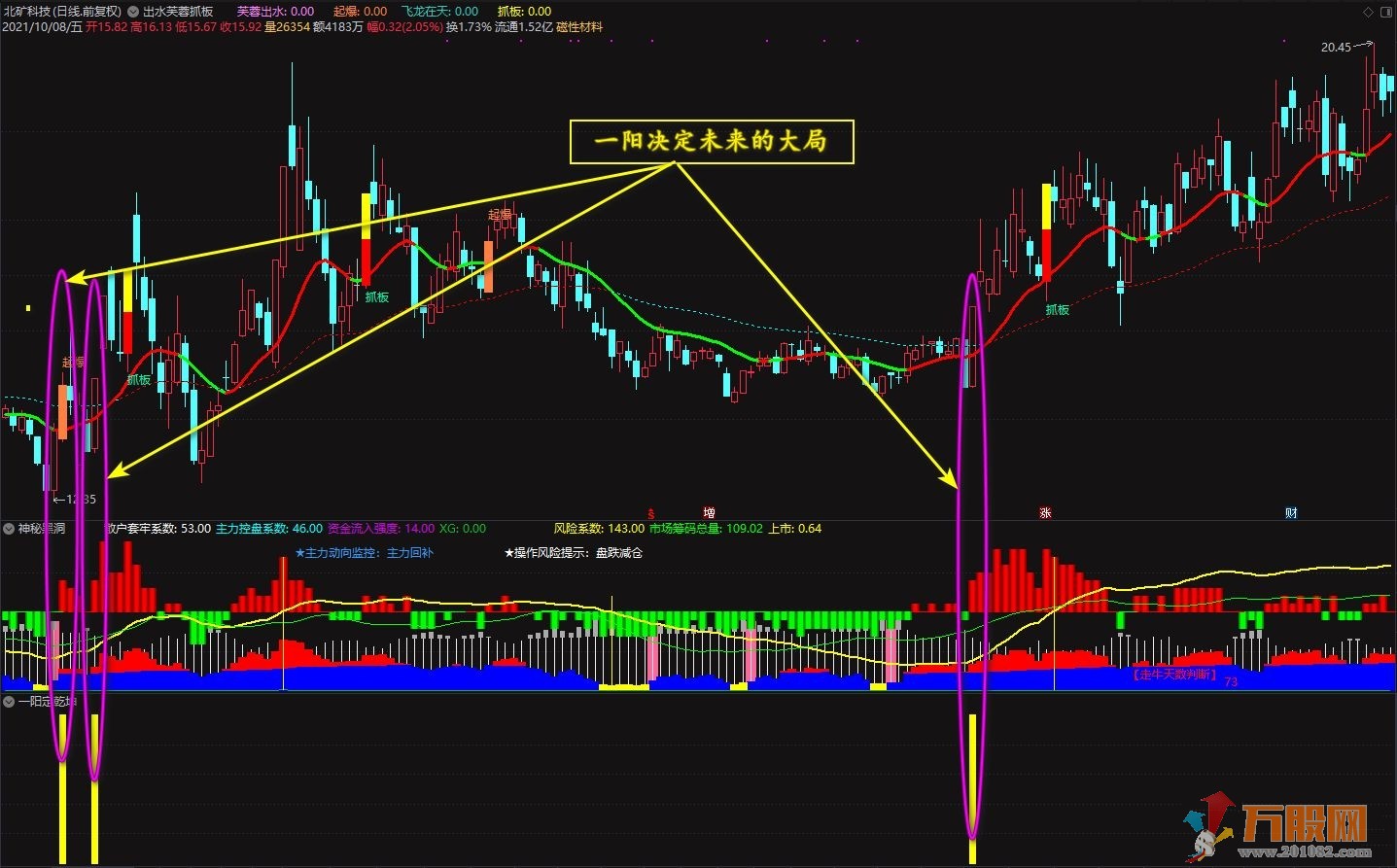 横盘日久时,【一阳定乾坤】!该指标为追涨指标,包含副图和选股公式各一个。信号清晰、实用,操作简单,直接上图: