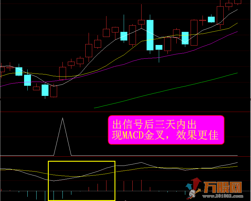 如果出信号后,在未来3天内MACD出现白色线金叉黄色线,效果更好!下图:
