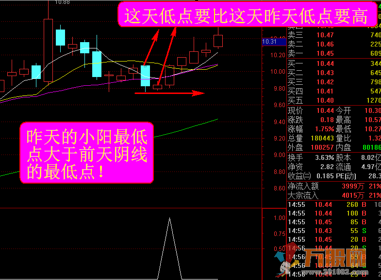 不管哪个股票,如果要上涨,那么就须满足先企稳再上涨,那么这个拐点指标设置了昨天是小阳企稳,前面有一波小的回调!需要昨天小阳的低点等于或高于前天阴线的低点,就是昨天最低不跌破前天的最低点!