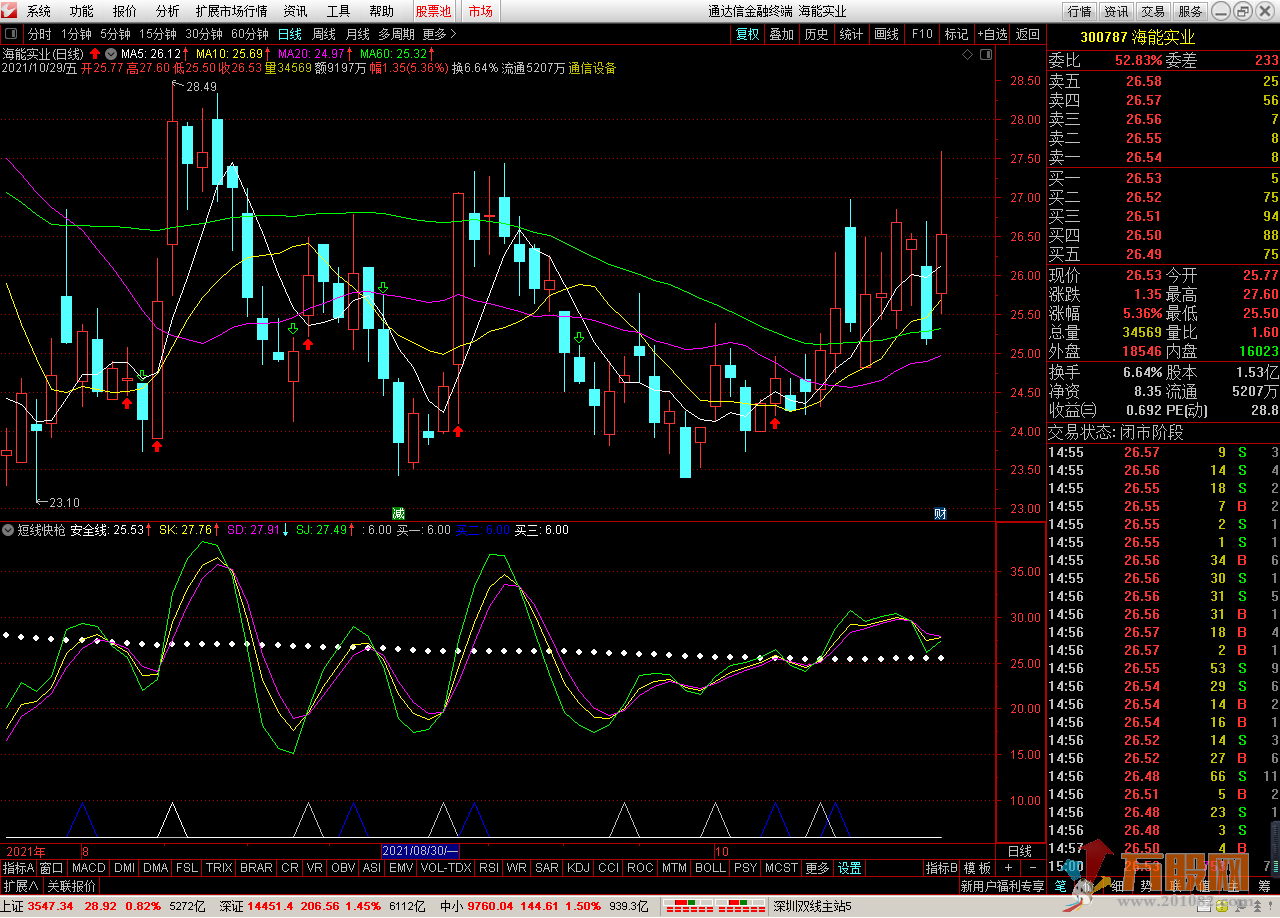 2、卖点:当“SK”线下勾、并与“SD”线死叉时卖出。