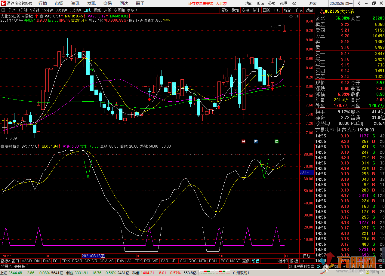 C、如“SK”、“SD”线与“20”低吸线金叉或在“20”低吸线上“SK”、“SD”线金叉,一般都有一段较为理想的涨幅,而且相对安全得多。