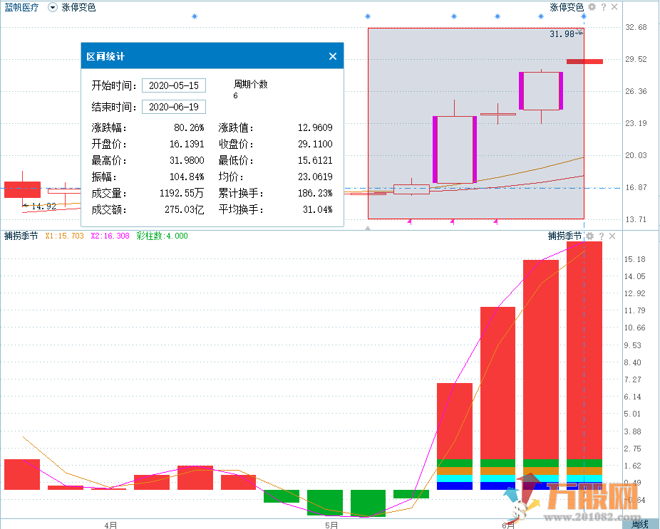 如上两图,案例为蓝帆医疗,在同一时间段下(2020年3月30-4月24),在周线级别下的金叉波段,股价走势总体往上,在此基础上再操作日线的金叉波段,成功率和收益率更高。