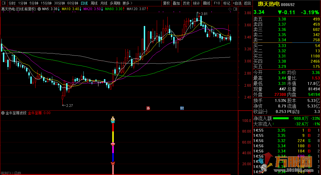 【金牛至尊波段】是一款波段类型的指标,,该指标适合喜欢波段类型操作风格的朋友,这款指标旨在寻求一个波段起动点,由于波段走势的行情时间有长有短,盈利也大小有别,所以波段指标就不做意义不大的公式测评。然而怎么样才能知道波段类型指标的优点和缺点呢?最好的办法就是随机选取指定任意一个股票,然后看看该股票近10年左右的全局信号,这样就能反应波段指标的历史走势情况,一目了然,这样可能比纯粹指标测评来的更有说服力。