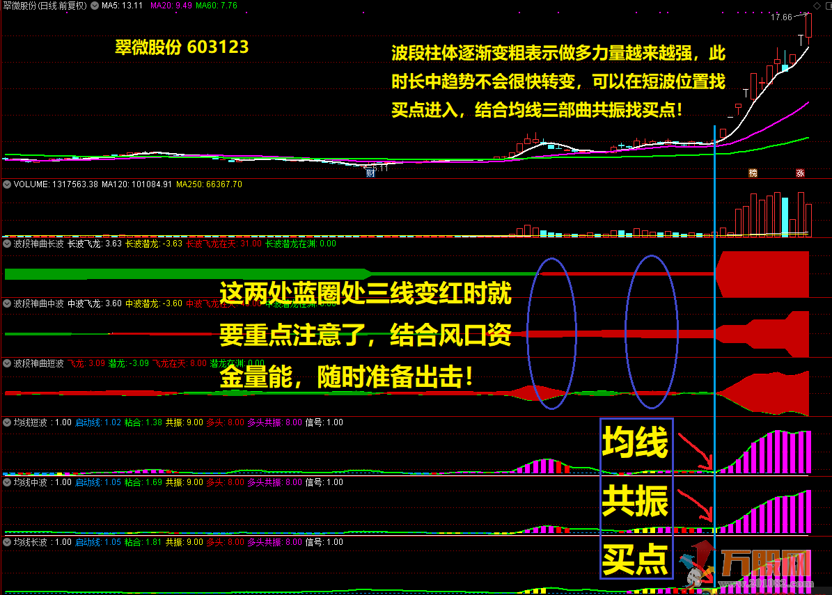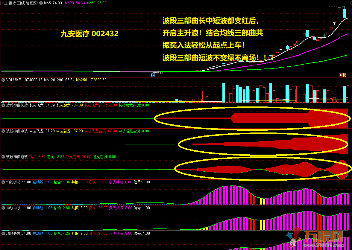 2. 长中波由细变粗代表做多力量增强,在短波上结合均线三部曲寻找买点。